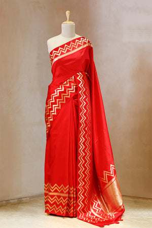 This red Banarasi Puna silk saree features a classic plain body, and intricate gold zari woven geometrical zig-zag pattern on the border and pallu for a stand-out look. It's a perfect option for both traditional and formal occasions. It comes with a matching unstitched blouse piece, for customized tailoring.