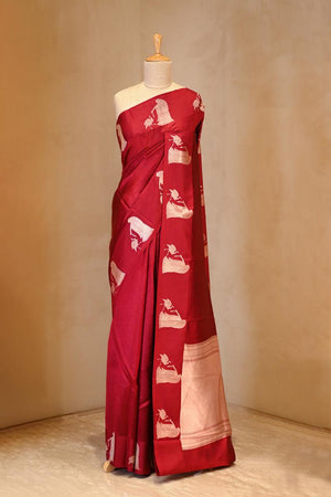 This red Banarasi silk saree features intricate resham tanchoi weaving throughout the body. The border is highlighted with a gold zari woven with woman and swan motifs, while the pallu carries a brocade-style design. It is paired with a matching unstitched blouse fabric designed with tanchoi weaving and gold zari motifs for custom stitching.