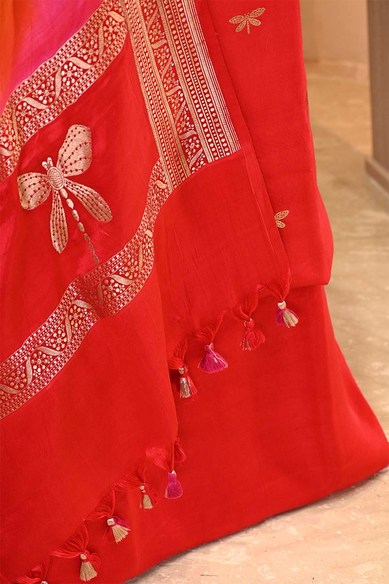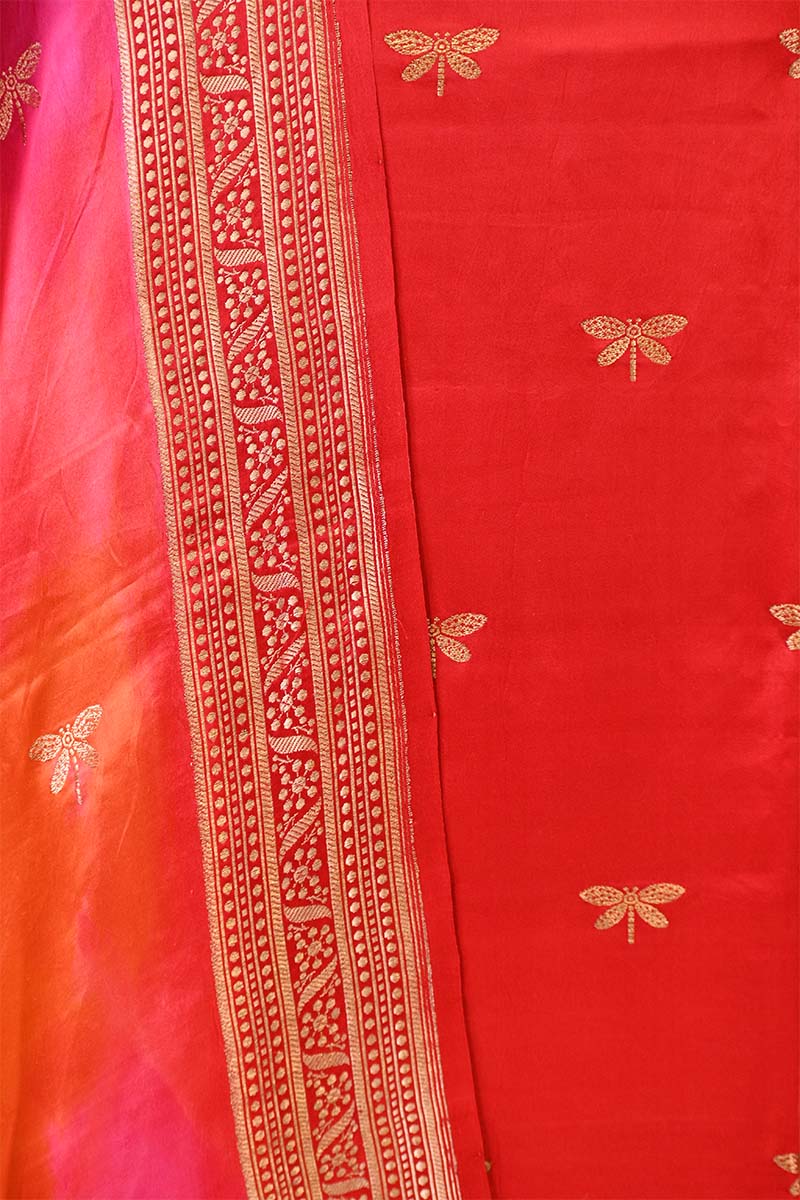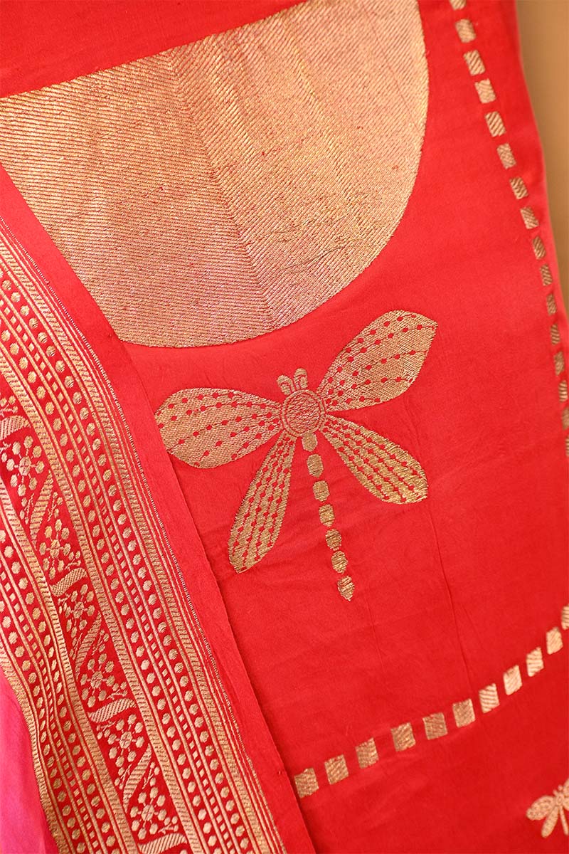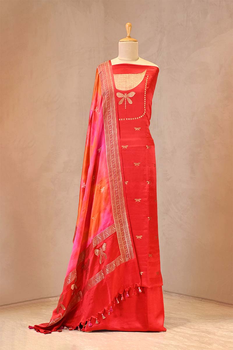 This red Gaji Banarasi suit set features an elegant golden half-moon design on the neckline, highlighted with delicate dragonfly motifs around it and subtle firefly motifs spread gracefully across the body. It is paired with a matching bottom fabric and a shaded gajji silk dupatta, finished with graceful dragonfly detailing along the border.