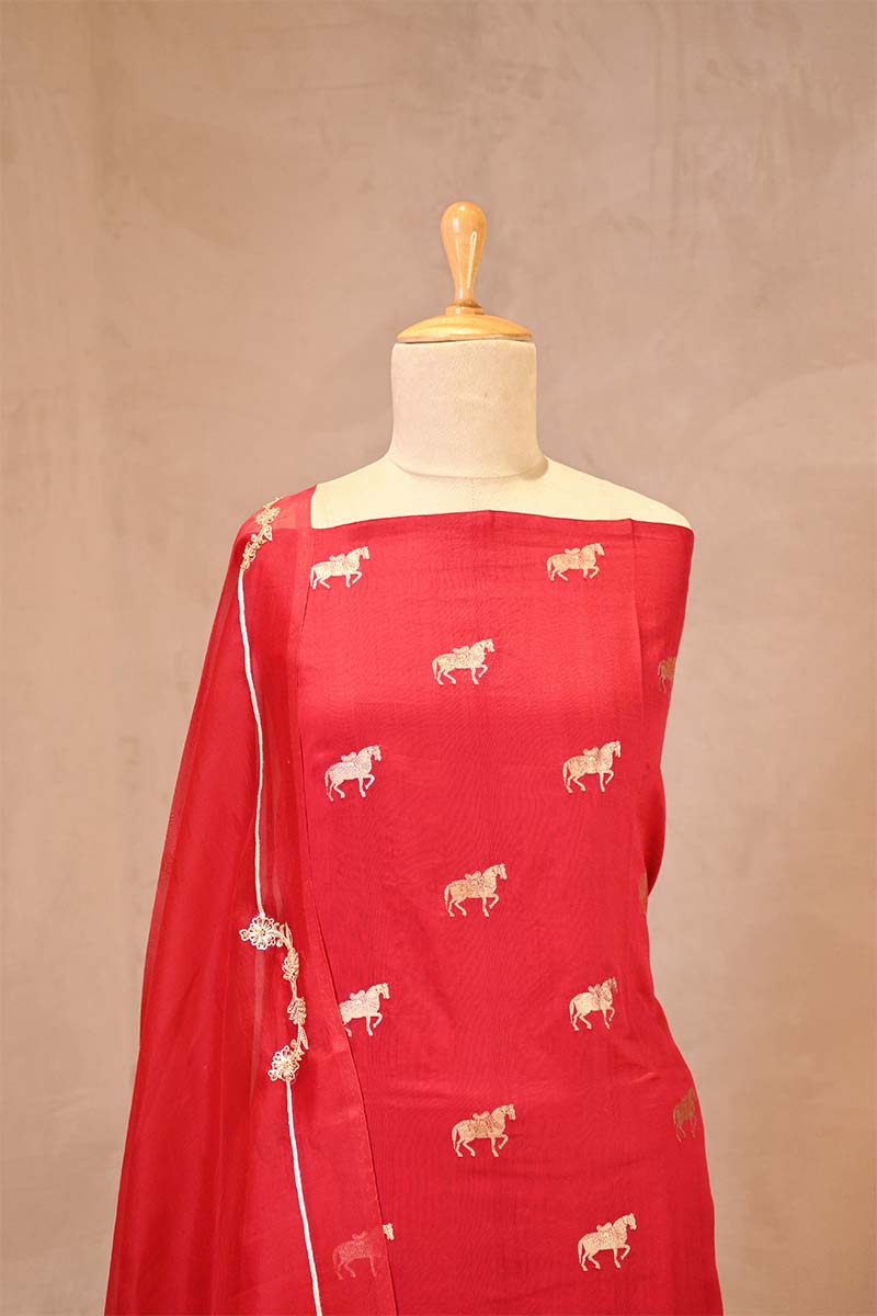 This Red Chiniya silk suit set is a beautiful blend of richness and tradition. The kurta features elegant gold zari Ashva motifs spread gracefully across the fabric, giving it a royal touch. It comes with a matching bottom and a Red organza dupatta detailed with small butis and delicate floral sequin, cutdana, and gotta patti work placed along the edges. The dupatta is finished with a single-fringe cut border.