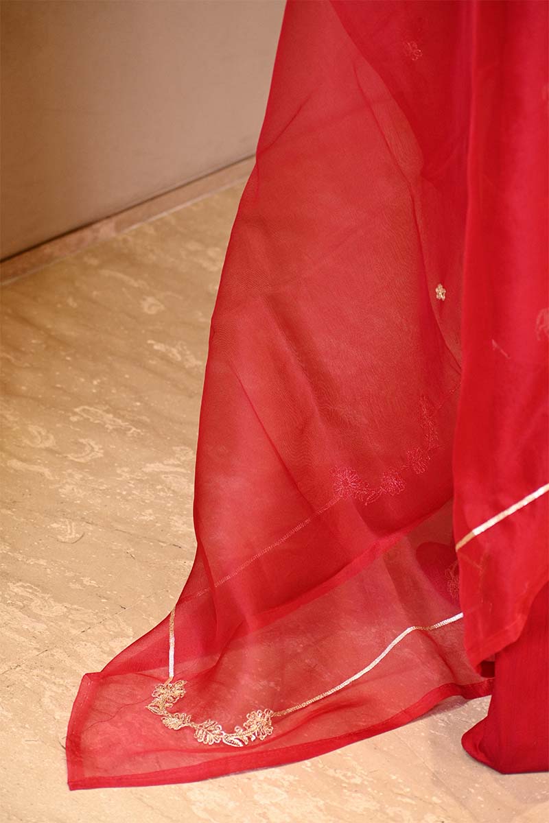 • Dupatta: Red organza with small butis and floral sequin, cutdana, and gotta patti embellishments on the edges