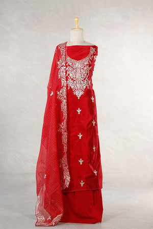 This Red dupion silk suit set is designed for festive occasions and traditional gatherings. The kurta features a V-shaped neckline heavily embroidered with floral pitta zari work. It is further detailed with pitta zari woven floral buti and embellished motifs spread across the kurta. Paired with an embellished organza silk dupatta showcasing hand-embroidered buti and a scalloped embellished border, the set is completed with a plain silk matching pant fabric, making it a well-coordinated dress material.