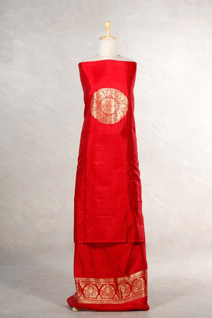 This red dupion silk suit set includes two unstitched pieces designed for festive wear and traditional gatherings. The kurta features a golden zari woven ethnic circular mandala motif placed prominently, offering a heritage-inspired touch. It is paired with a matching bottom fabric that carries an intricately designed golden zari woven border, perfect for enhancing the ankle line when stitched. This dress material is ideal for occasions that call for minimal yet defined detail.