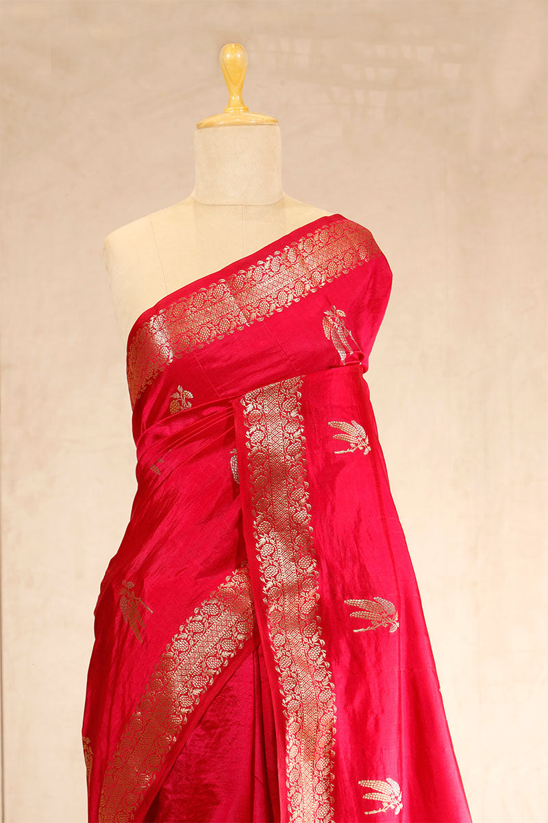 This Red Dupion silk saree features intricately woven gold zari buta across the body, adding a refined traditional appeal. The saree is complemented with a matching gold zari woven border and pallu that enhance the richness of the fabric. It comes with a matching unstitched blouse piece to complete the ensemble.
