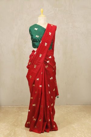 This red banarasi chiniya silk saree is handloom woven with intricately gold zari Aghanya (cow) motifs across the entire body, symbolizing cultural heritage and grace. The saree is paired with a green contrast unstitched blouse piece, also featuring gold zari woven Aghanya motifs, allowing for a coordinated and personalized look.
