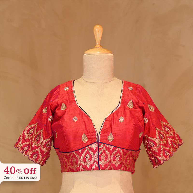Tips: Pair this red Banarasi blouse with a matching saree or lehenga and statement gold jewelry for a regal festive look.