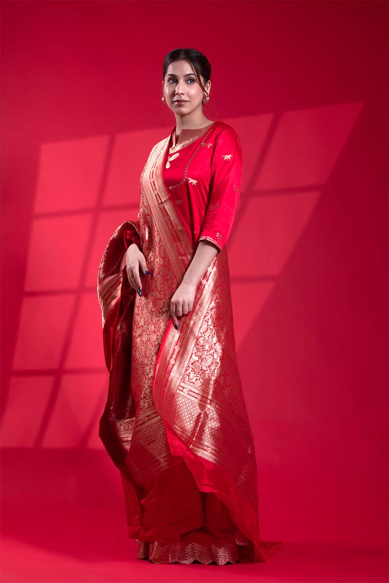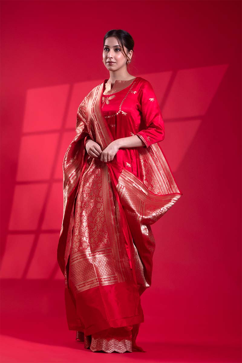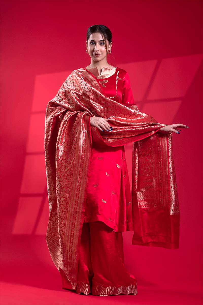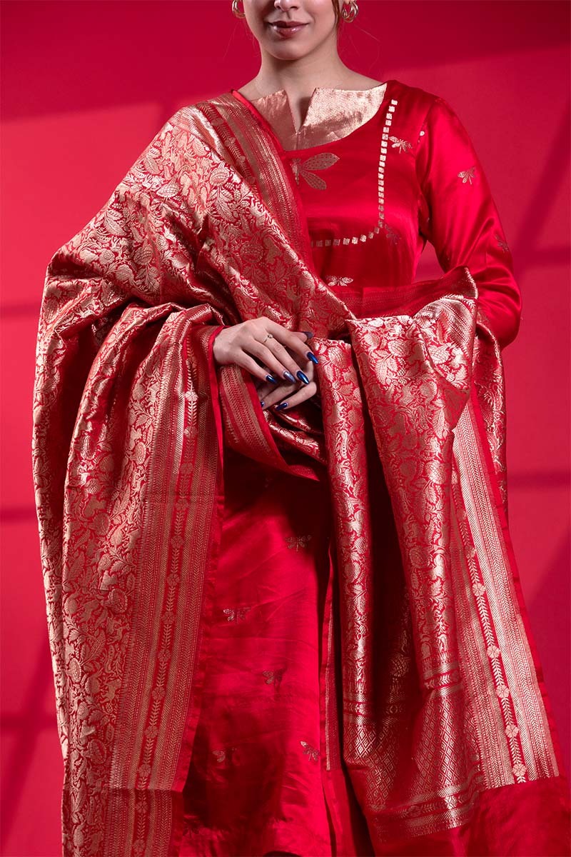 Tips: Pair this red Banarasi Katan silk dupatta with a matching red kurta for a coordinated look or opt for a contrasting cream kurta for a classic style statement.
