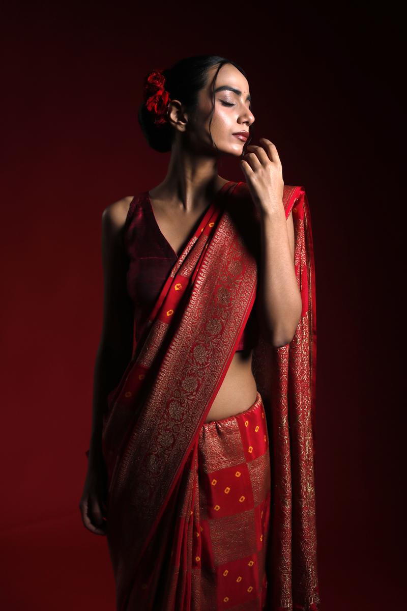 This Red khaddi crepe silk saree is woven with antique zari woven geometrical ethnic motifs and a beautiful bandhani print throughout the fabric. It features a floral zari woven border and pallu that adds a touch of sophistication. The saree comes with a running blouse piece, making it an ideal choice for various occasions.