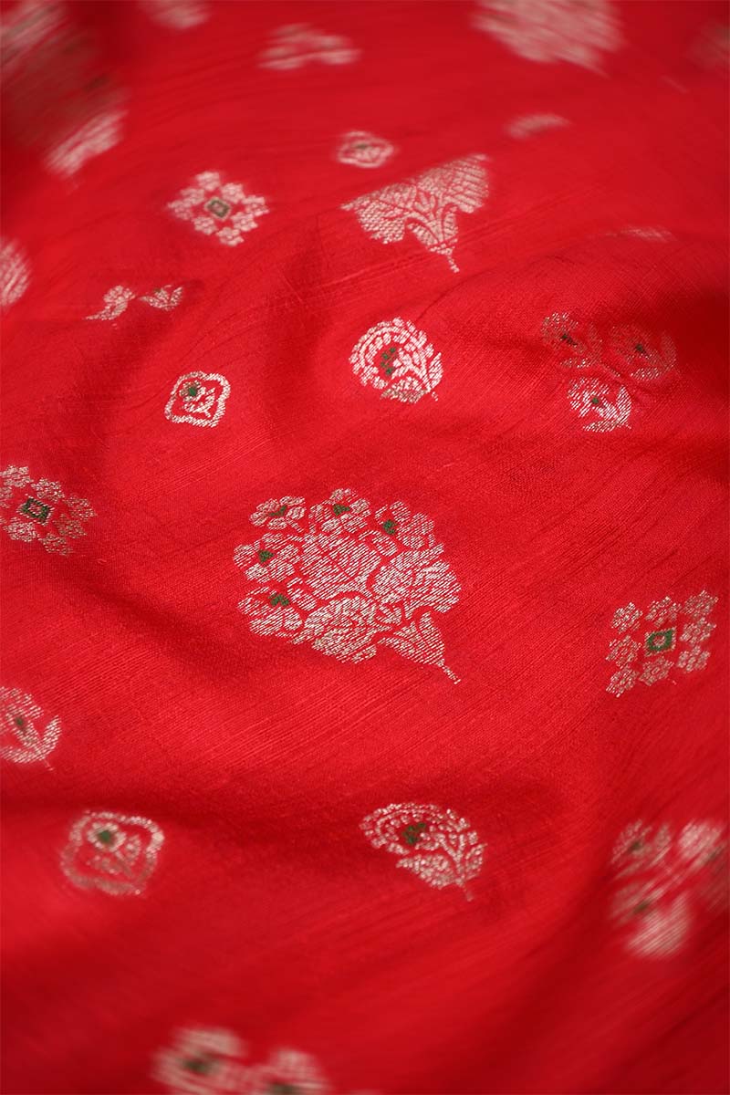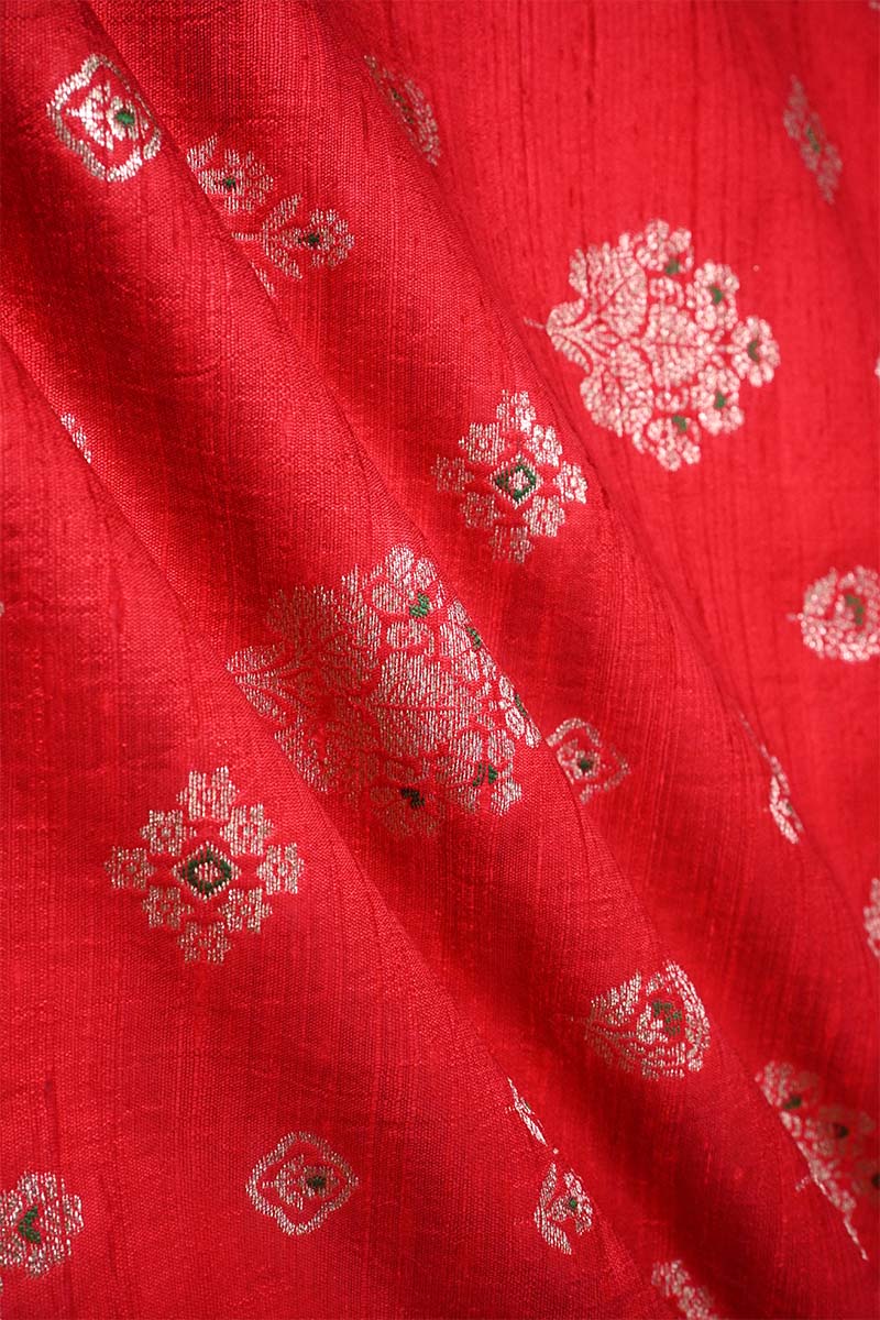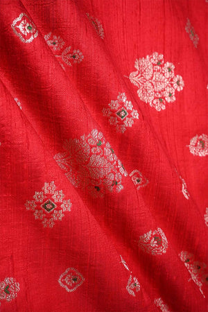This red raw silk fabric features antique zari-woven floral and ethnic motifs, further enhanced with green meenakari details. The textured raw silk base paired with intricate zari and meenakari work makes it a standout option for traditional attire.
