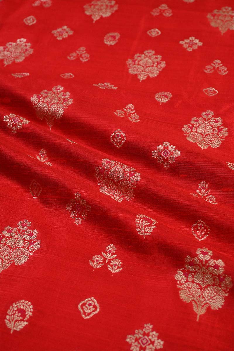 This Red raw silk fabric features antique zari-woven floral and ethnic motifs, further enhanced with pink meenakari details. The textured raw silk base paired with intricate zari and meenakari work makes it a standout option for traditional attire.