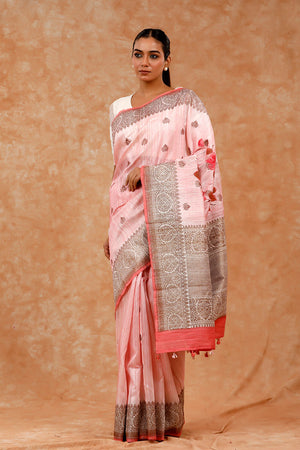 Adorn yourself in the splendour of tradition with this raw silk saree featuring antique zari woven buta and hand-painted floral motifs with shaded effects throughout. The antique zari contrast border enhances its regal charm. Meticulously crafted, this saree combines heritage with contemporary elegance. Paired with a matching unstitched blouse piece, it offers versatility in styling.