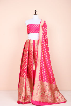 Features: Handwoven gold zari weaving all over it has meenakari on the skirt with paisley motifs & dupatta, the unstitched blouse has woven gold zari small buti & dupatta has also gold zari woven border & palla