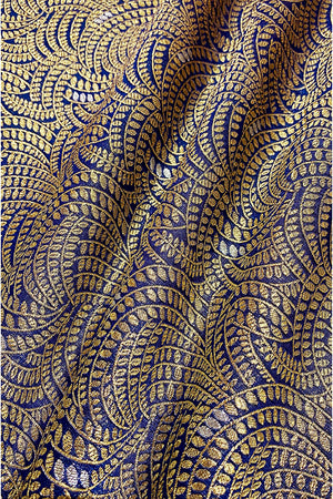 This royal blue brocade Banarasi silk fabric features an exquisite combination of gold and silver zari with an intricate jaal woven pattern. The regal design makes it an ideal choice for creating a stunning blouse or dress.
