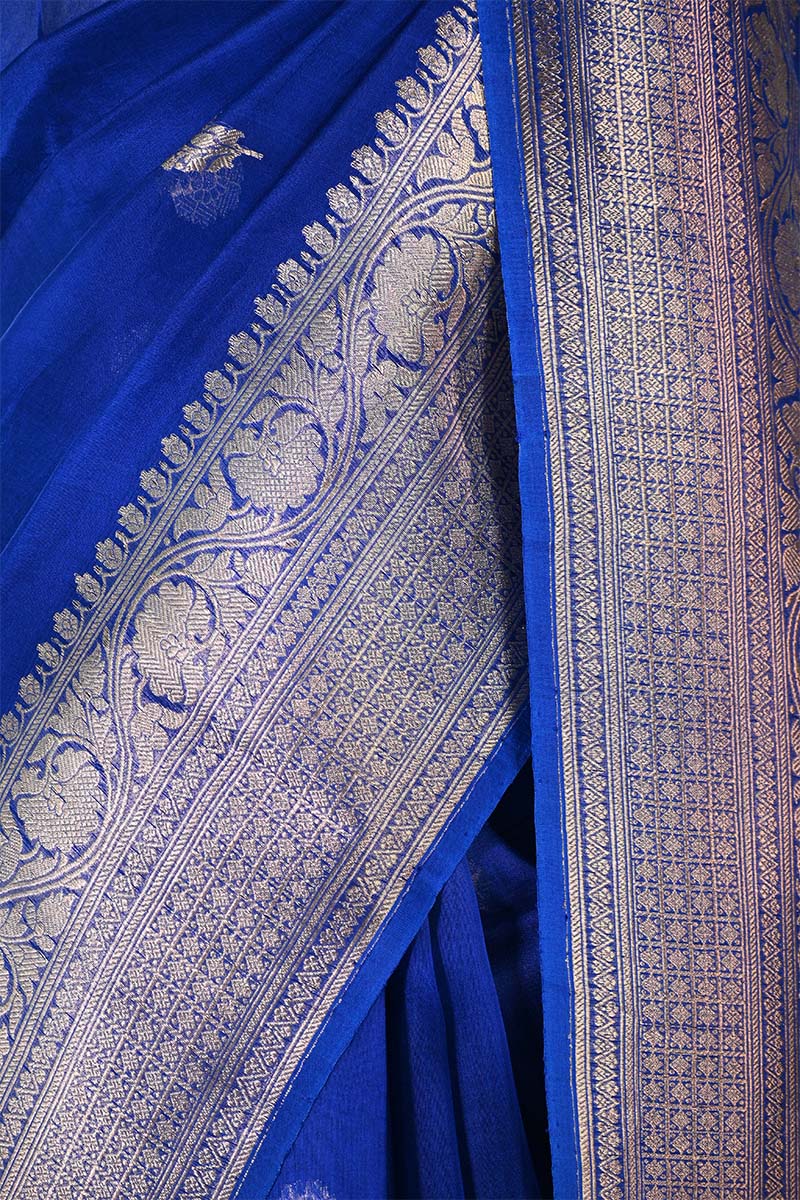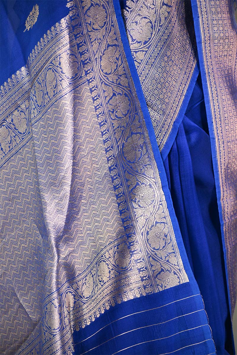 This royal blue organza silk saree is designed with gold zari woven ethnic buta motifs on the body. The border and pallu are intricately woven with gold zari floral patterns. It is lightweight and comfortable, making it suitable for parties and wedding celebrations. The saree is paired with a matching plain unstitched blouse piece featuring a floral gold zari stripes for custom stitching.