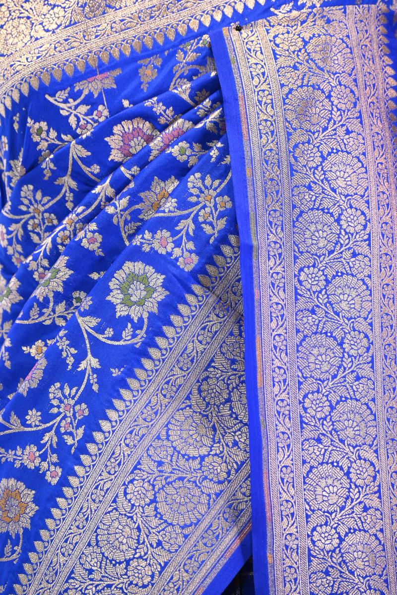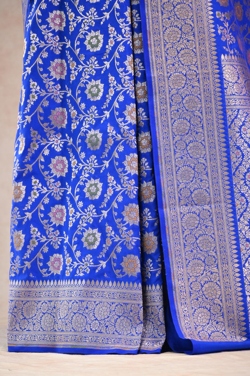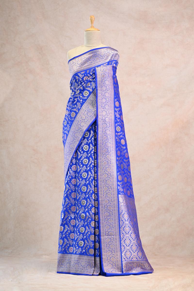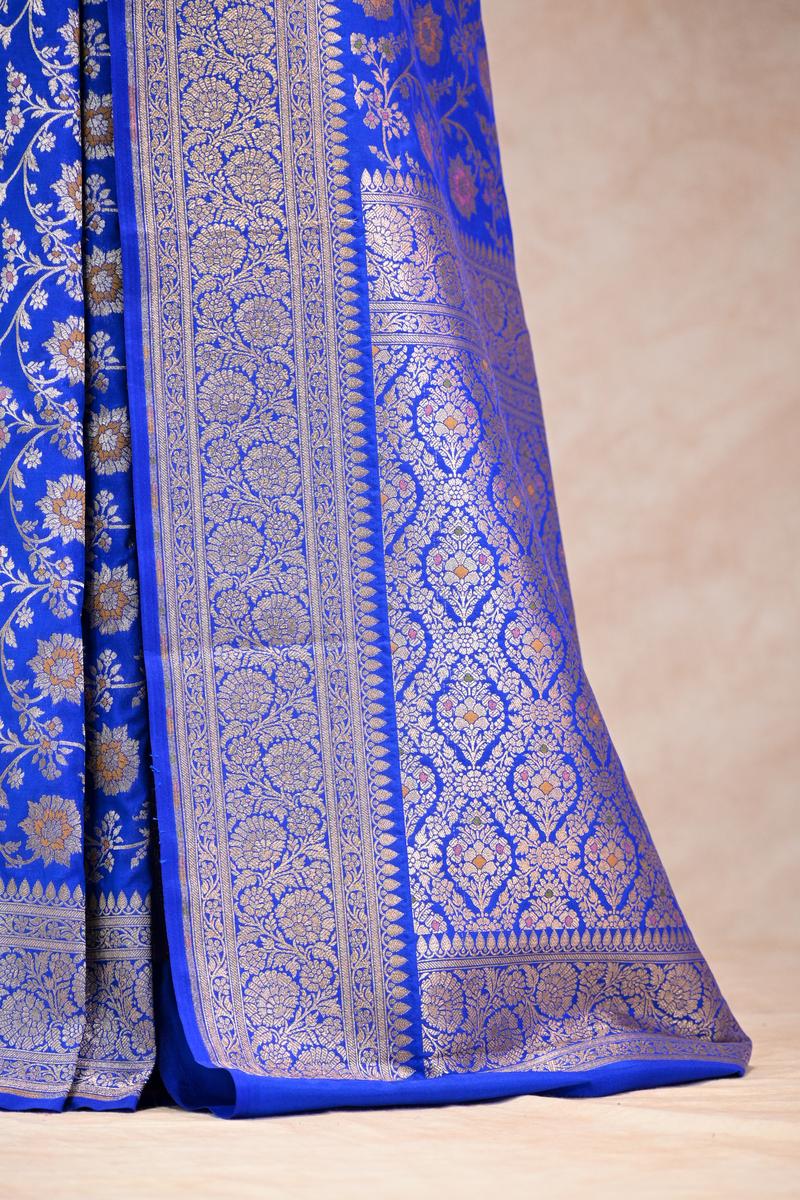 This royal blue semi-silk Banarasi saree is crafted from a blended silk fabric that gives a rich feel and a well-structured drape, similar to pure silk. The body is beautifully detailed with an all-over gold zari woven floral pattern, enhanced with subtle resham weaving that adds depth and elegance. The border and pallu feature classic floral gold zari weaving, bringing a timeless traditional touch. The saree comes with a matching unstitched blouse piece, making it perfect for festive and special occasions.