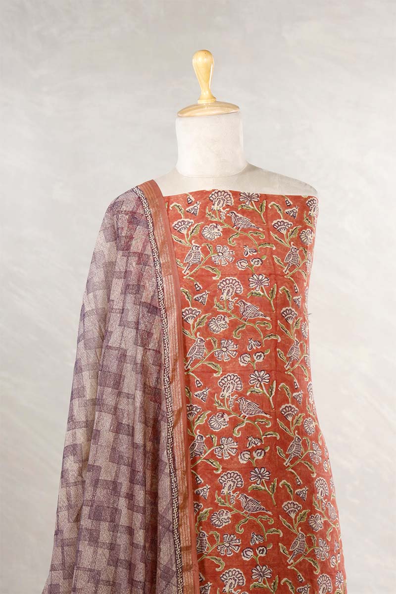 This rust brown suit set is made with mulmul cotton-based fabric, a comfortable option for casual gatherings and daywear. The kurta features an all-over floral print that adds soft character to the fabric. It is paired with a matching floral printed linen dupatta and a plain cotton bottom fabric, making this dress material a light and easy-to-carry choice for warmer days.