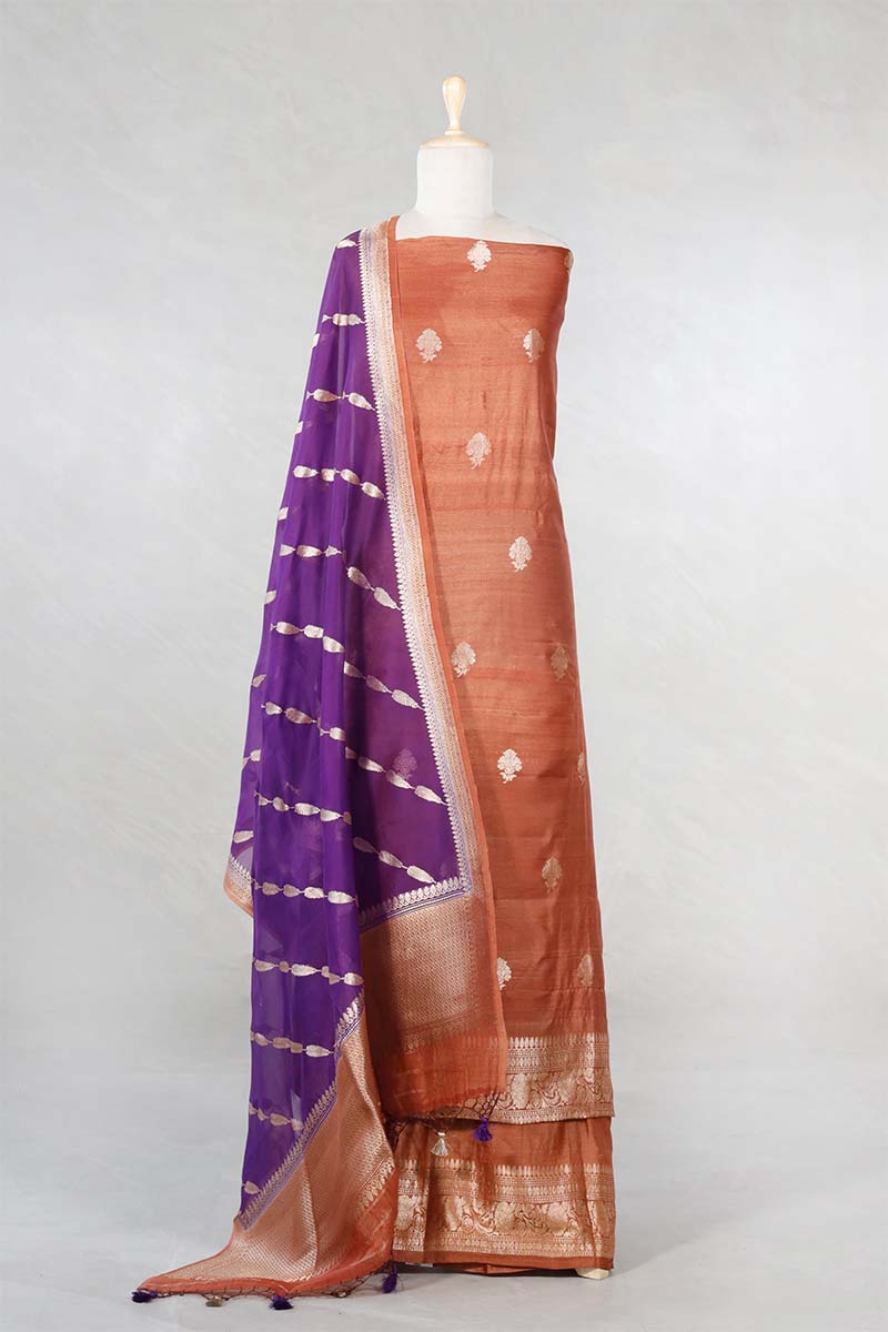 This Rust handloom Tussar silk suit set is suitable for festive occasions and traditional gatherings. The kurta is adorned with golden zari woven buta across the body and finished with a zari woven border along the hemline. It is paired with a purple organza silk dupatta, and the set includes a matching bottom pant fabric to complete this coordinated dress material ensemble.