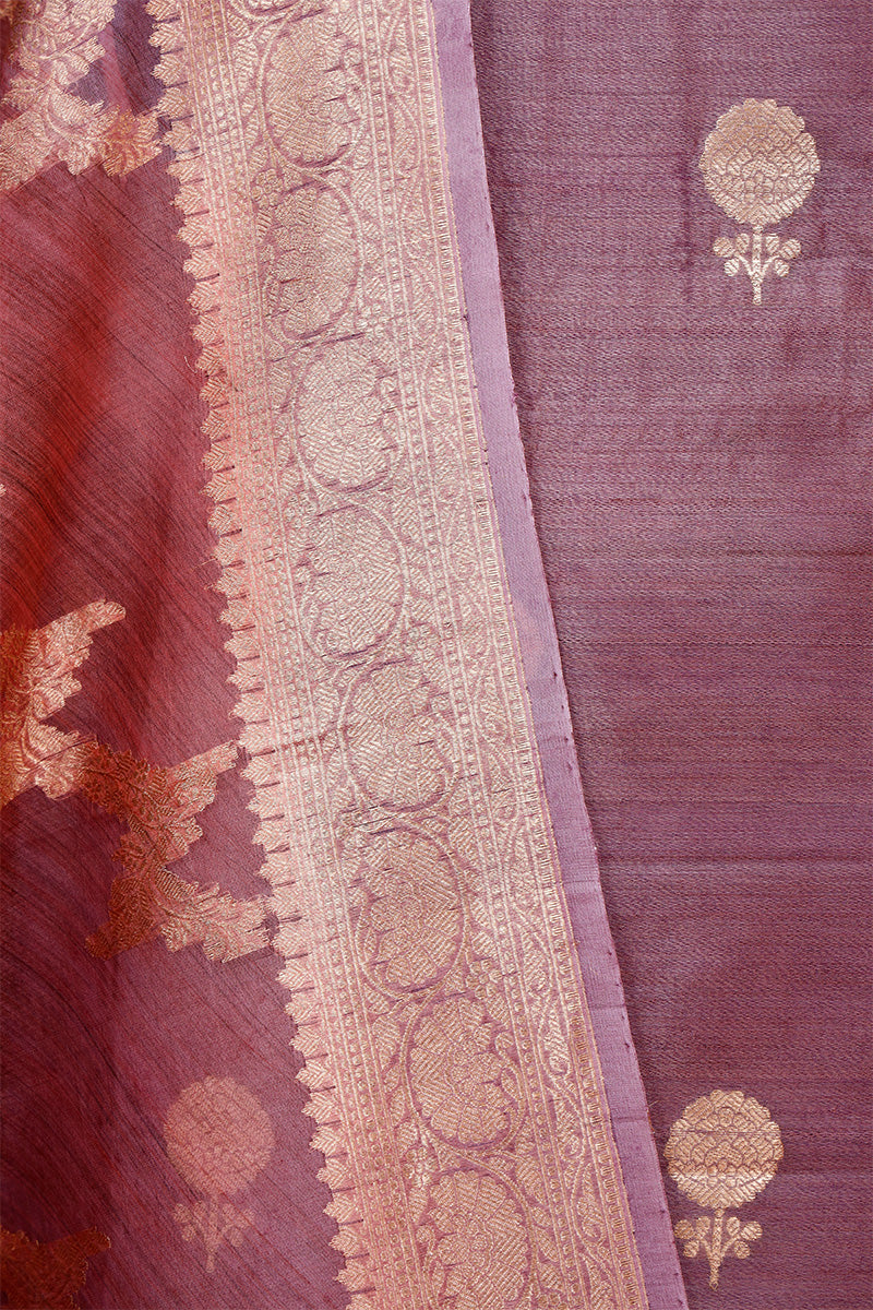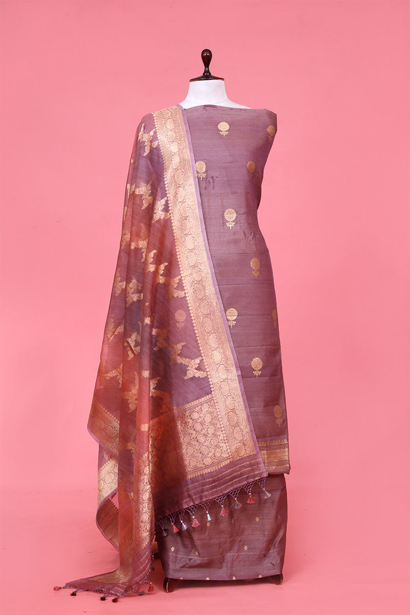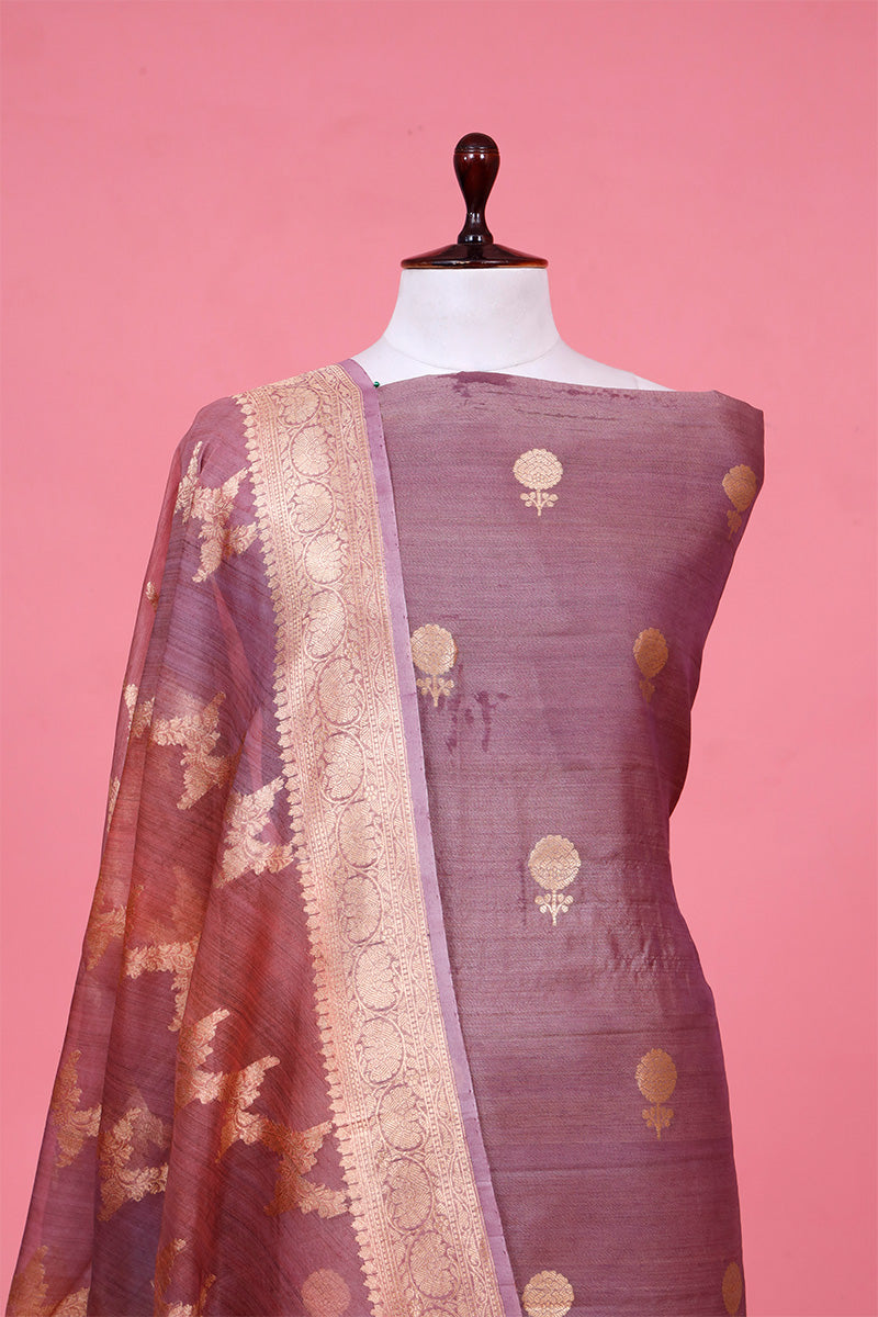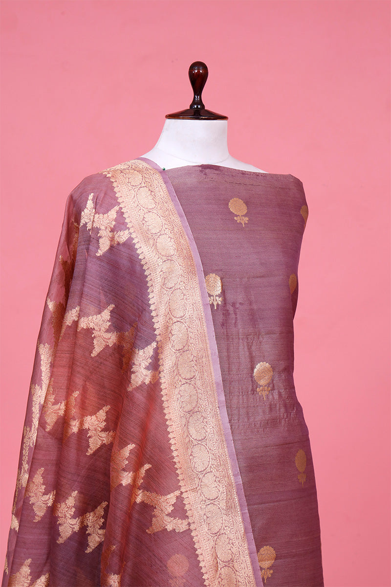 This rust mauve pure handloom Tussar silk dress material is a wonderful option for festive and cultural gatherings. The kurta features delicate gold zari floral buta and is finished with a detailed woven border. It comes with a coordinated plain Tussar bottom and a vibrant rangkat Kadhwa woven organza dupatta, making it a great addition to your wardrobe.