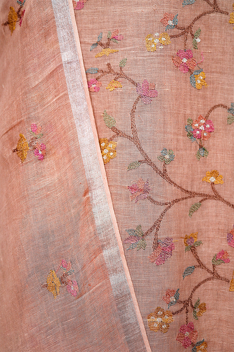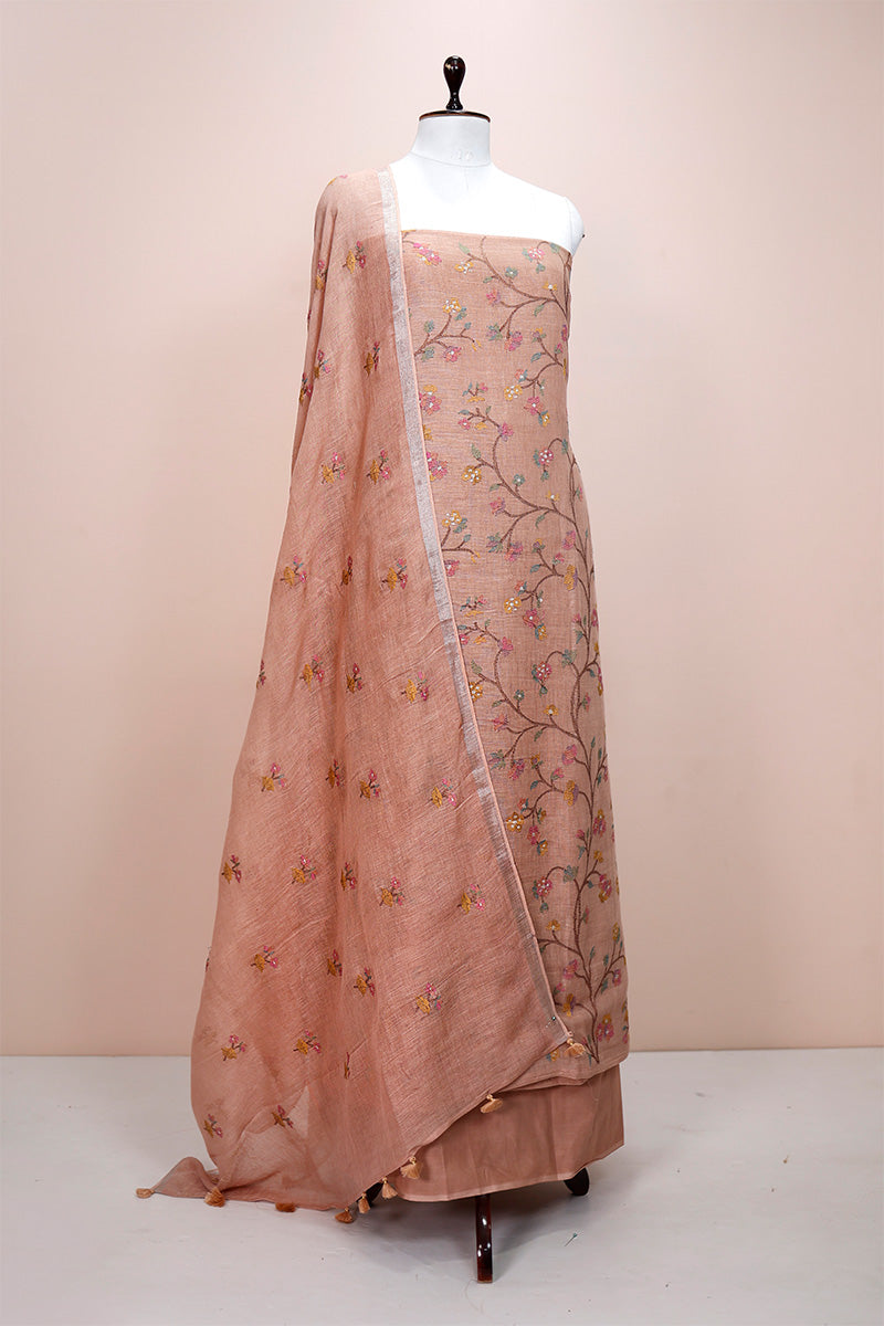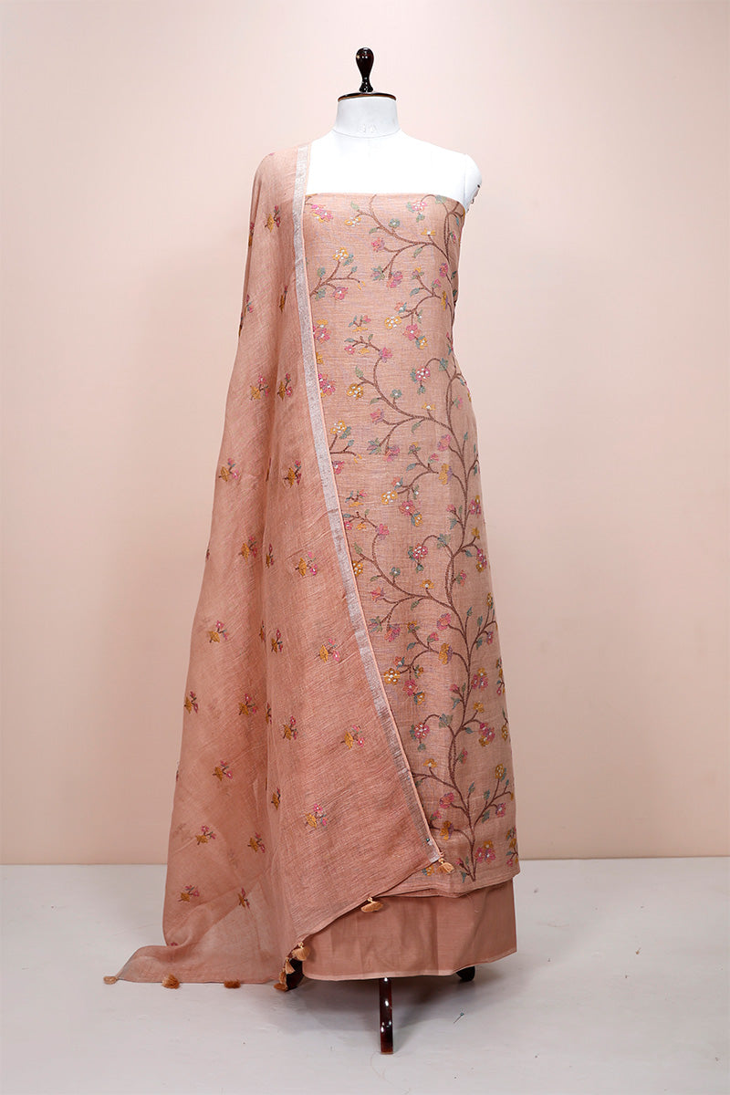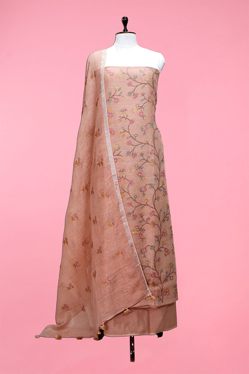 The coral peach color of this dress material is a warm and earthy shade of orange that is reminiscent of autumn leaves. It is a versatile color that can be dressed up or down and is suitable for both daytime and evening wear. The Linen cotton fabric is the perfect summer fabric as it combines the ability to remain cool and comfortable during hot summer days. The highlight of this delightful piece of dress material is that it has cross stitch embroidered floral jaal all over the kurta and it comes with matching linen dupatta which also has embroidered floral buta paired with plain matching bottom.