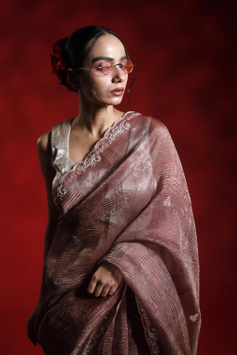 This rust crushed tissue silk saree features an ombre-effect base, enhanced with beads and resham embroidered floral motifs scattered across the body. The saree is further elevated with a beautifully embellished scalloped cutwork border detailed with beadwork. It is paired with a plain tissue silk blouse piece, featuring matching embellishment and cutwork detailing on the sleeves and edges.