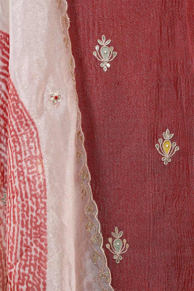 This Rust Red embellished crushed tissue silk suit set is a refined choice for festive gatherings and special occasions. The kurta features a round V neckline enhanced with intricate embellishments and floral buta scattered all over, adding a touch of elegance. Paired with a tie-and-dye embellished tissue silk dupatta adorned with a scalloped border and a plain silk matching pant, this dress material offers a complete and coordinated look.
