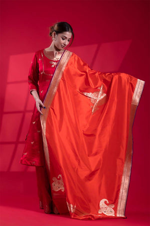 Tips: Pair this saffron Banarasi satin silk dupatta with a matching saffron kurta for a coordinated look or opt for a contrasting green kurta for a striking combination.