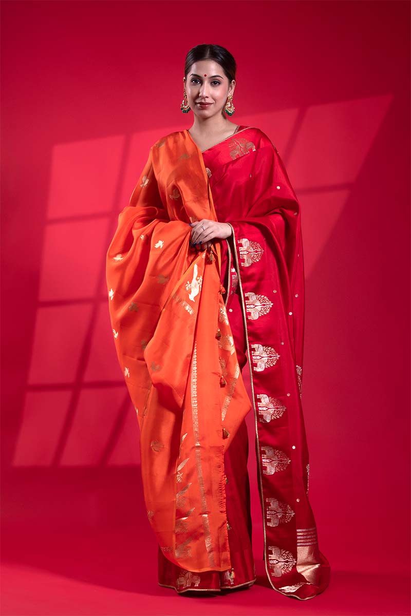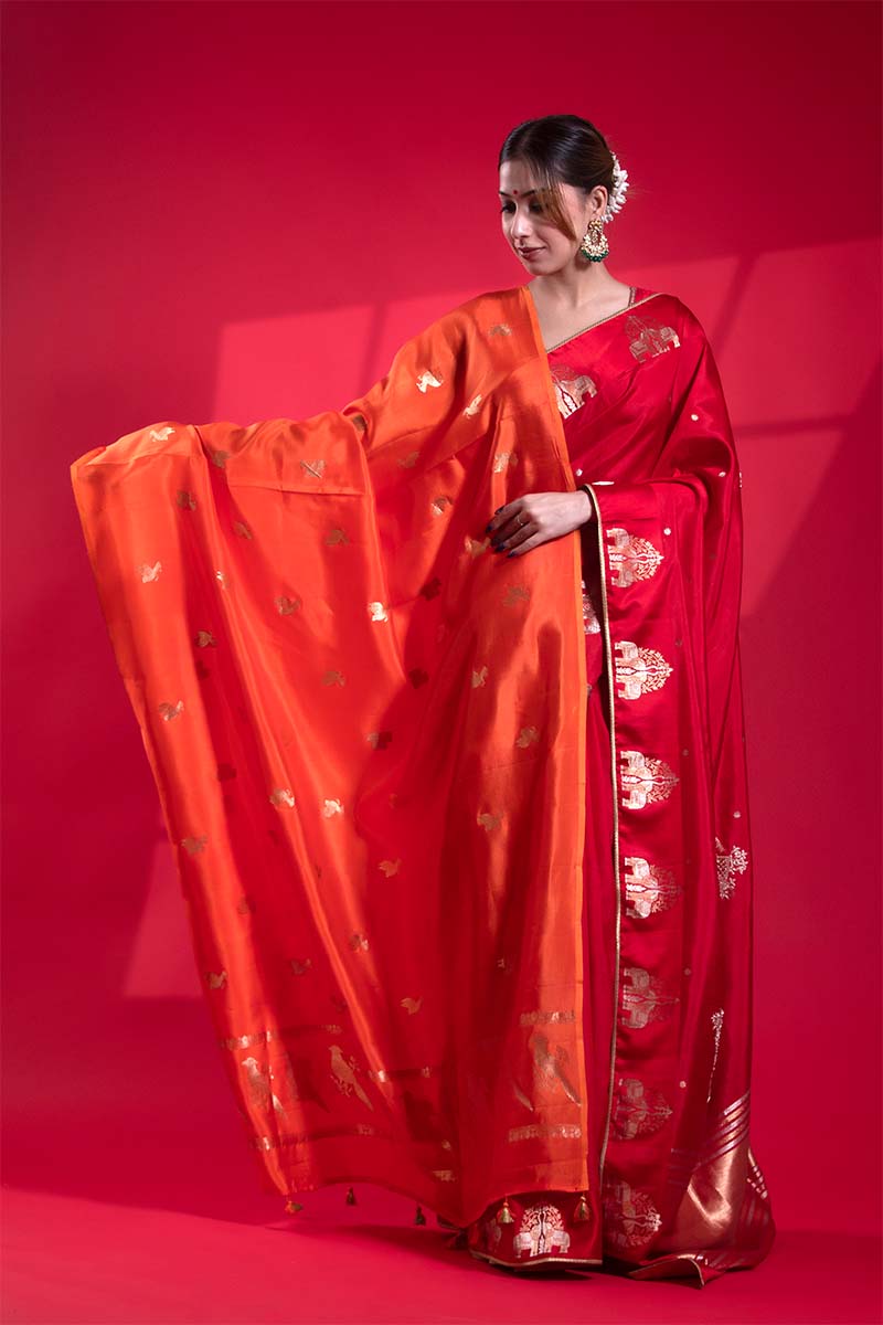 This Banarasi dupatta is crafted from soft, flowing pure banarasi silk fabric. The vibrant saffron color is adorned with intricate gold zari woven bird motif butis spread across the dupatta, while the pallu features matching bird motif butas for a cohesive design.