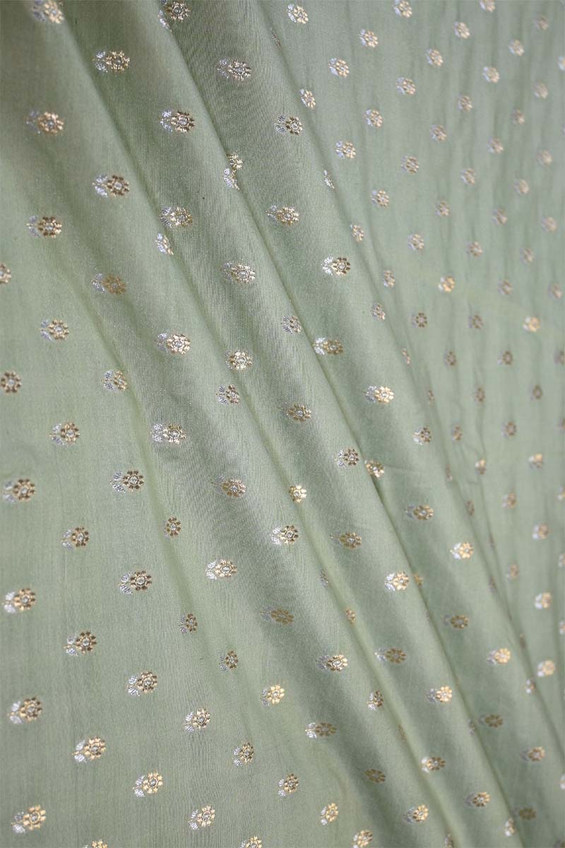 This Sage Green Banarasi silk fabric features small floral buti motifs intricately woven with sona-rupa zari across the fabric. Its subtle yet refined detailing makes it a versatile choice for creating both traditional with modern combo outfits.