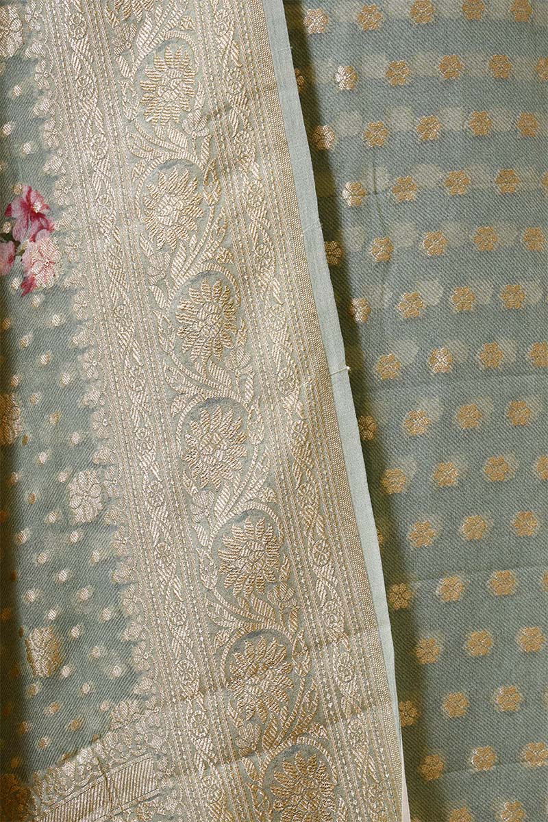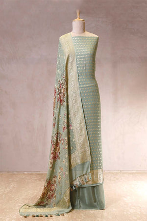 This sage-green Banarasi Georgette Khaddi silk suit set is designed for festive occasions and cultural gatherings. The kurta features gold zari woven floral buti all over, with an intricate gold zari woven border on the hemline for added detailing. It is paired with a floral printed Georgette Khaddi silk dupatta, enhanced with gold zari weaving, and a matching crepe bottom pant, making this dress material a well-coordinated choice for special events.