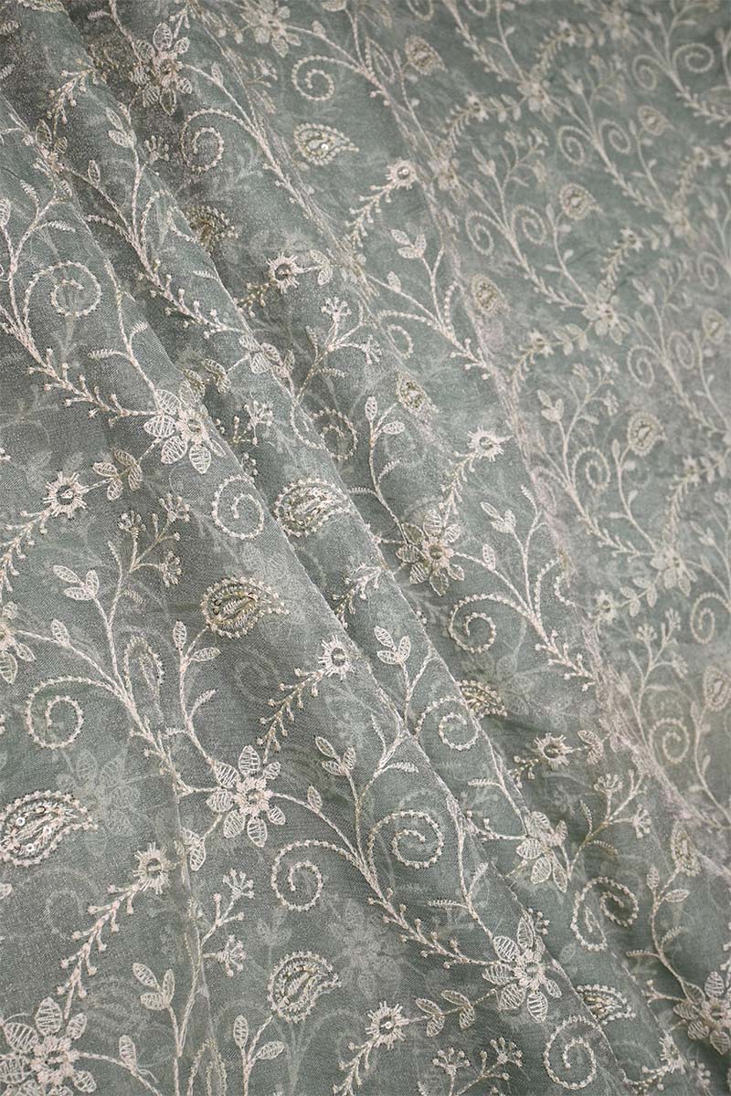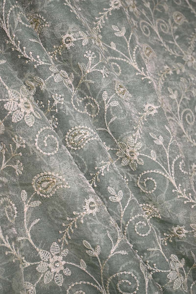 This sage green tissue silk fabric features delicate resham chikankari floral embroidery, complemented with detailed leaf and floral patterns in white thread work. The lightweight tissue base with fine embroidery makes it perfect for graceful and contemporary outfit designs.