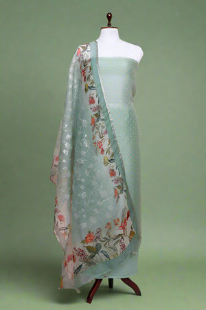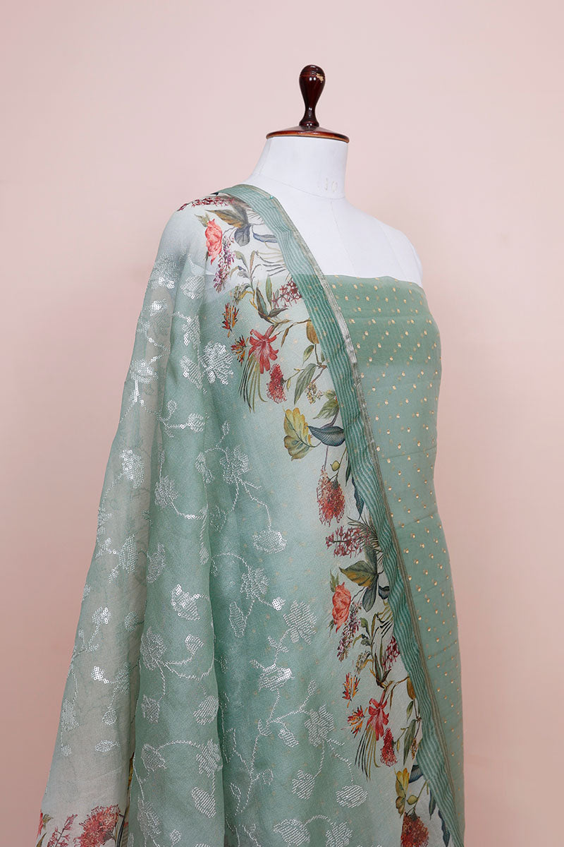 Step up your style quotient by getting a salwar suit stitched from this green-coloured dress material. Featuring gold zari woven small circular butis all over the kurta, this fabric comes with a matching organza silk dupatta with sequence embellishment and digitally printed floral motifs. The plain matching cotton bottoms enhance the overall look of this dress material making it a worthy buy.