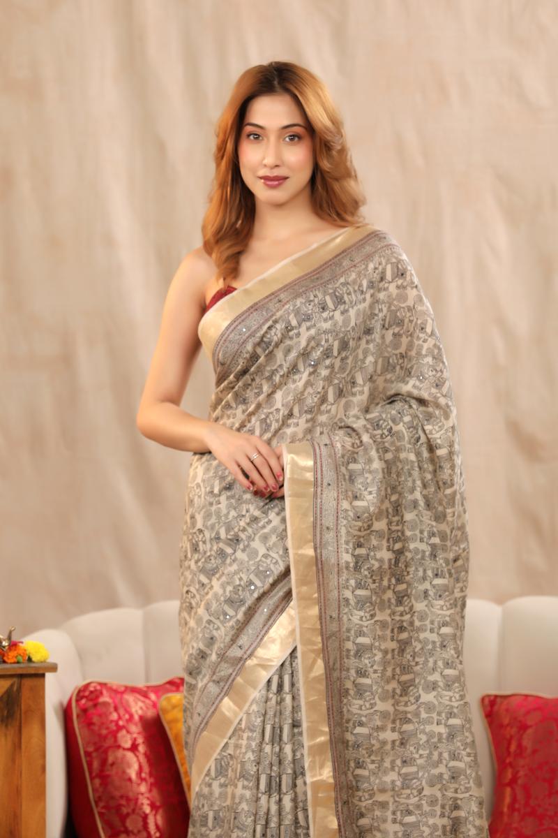 This Sand Beige Moonga Silk Saree features block printing with repeating animal motifs spread gracefully across the body. Subtle mirror work is delicately placed throughout the saree and highlighted with fine kantha embroidery. The border and pallu are finished with elegant gold zari weaving. It comes with a matching unstitched blouse piece to complete the look.