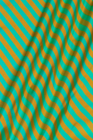 This sea green Banarasi satin silk fabric features bold yellow horizontal stripes woven throughout. The smooth texture and vibrant design make it a great choice for crafting a unique blouse or dress.