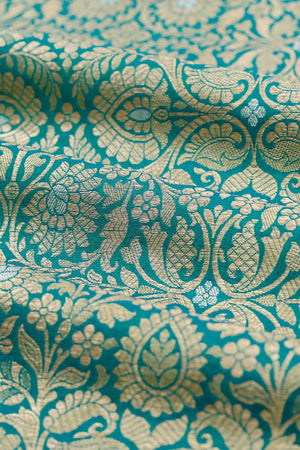 Our Sea Green Handwoven Banarasi Silk Than comes with woven motifs that surface a floral jaal pattern including a golden zari work. A fabric made by handloom weaving, for your quintessential statement party wear.