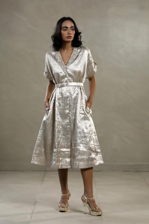 This SIlver tissue silk cocktail dress blends festive texture with a flattering silhouette. Featuring an all-over water gold zari brocade jaal, the wrap dress comes with an embellished V-neckline, cap sleeves, and a high-low hemline. A self-tie waist and detailing on the collar and waistband add a graceful finish.