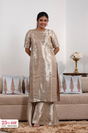 This silver tissue silk sharara suit is designed with a balance of tradition and style. The straight-cut kurta features an all-over silver zari tanchoi floral brocade jaal, highlighted with a round neckline and half sleeves. It is paired with coordinated sharara-style bottoms in matching tissue silk fabric, making the outfit an ideal choice for festive and celebratory occasions.
