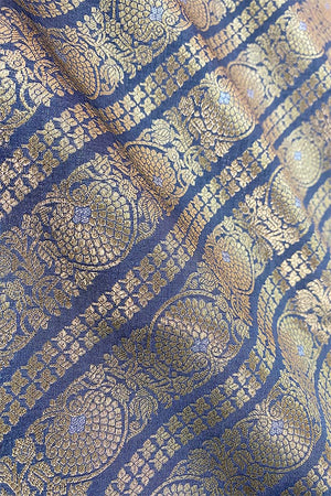 Nail the perfect look for the upcoming event by stitching an outfit from this classic grey-colored fabric. Made of quality banarasi silk, this fabric has a sheen and fall that cannot be missed. The woven gold zari stripes all over add to the overall charm of this piece making it a compelling buy. Light in weight, this fabric also makes a good gifting option.