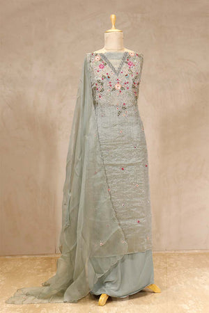 This slate grey embellished Banarasi tissue silk suit set is a perfect blend of tradition and modern elegance, making it ideal for festive occasions. The kurta features a V-shaped neckline with intricate floral hand embroidery and mirror work, complemented by embellished motifs throughout. Paired with an embellished organza silk dupatta adorned with a scalloped border and hand-embroidered buti, the set is completed with a plain silk matching pant for a polished finish.