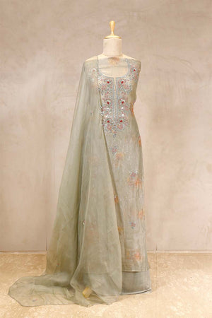 This Slate Grey embellished tissue silk suit set is an elegant choice for festive celebrations and cultural gatherings. The kurta showcases a U-shaped neckline adorned with intricate floral hand embroidery, floral prints, and embellished motifs, creating a stunning visual appeal. Paired with a floral-printed and embellished organza silk dupatta featuring a scalloped border and hand-embroidered buti, this set is completed with a plain silk matching pant for a balanced and sophisticated look.
