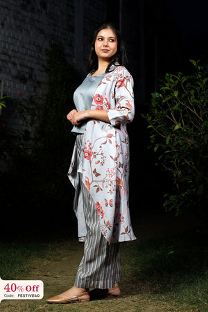 Unveil sophistication with this chanderi silk co-ord set. Featuring a plain chanderi silk inner top, it radiates elegance. The ensemble is elevated by a floral-printed shrug with 3/4th sleeves, adding a touch of grace. Paired with striped matching bottoms, this set embodies contemporary style and comfort. Wear this co ord set with matching accessories to look your best for the upcoming event.