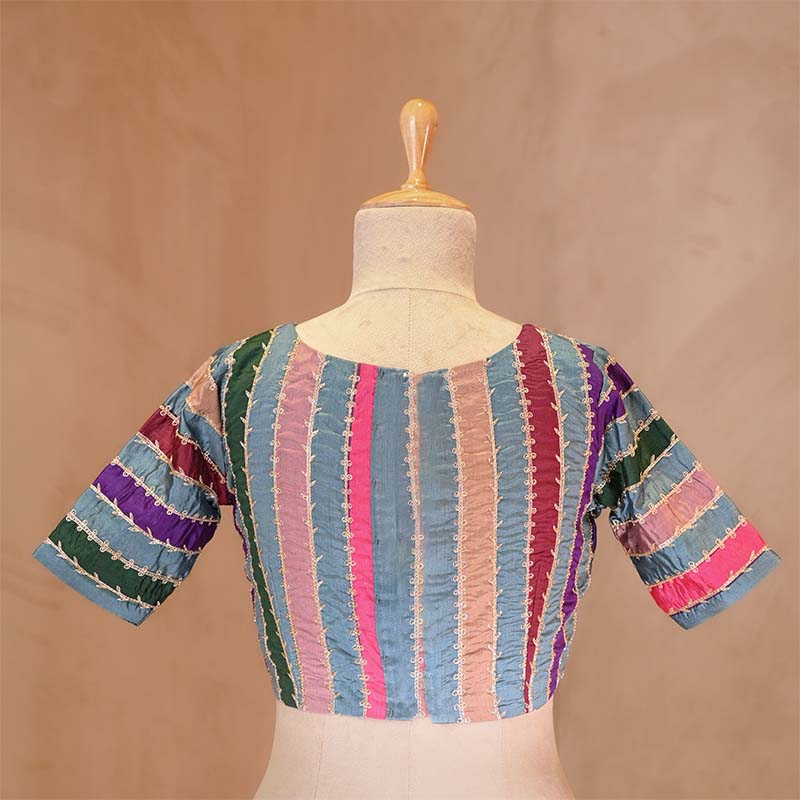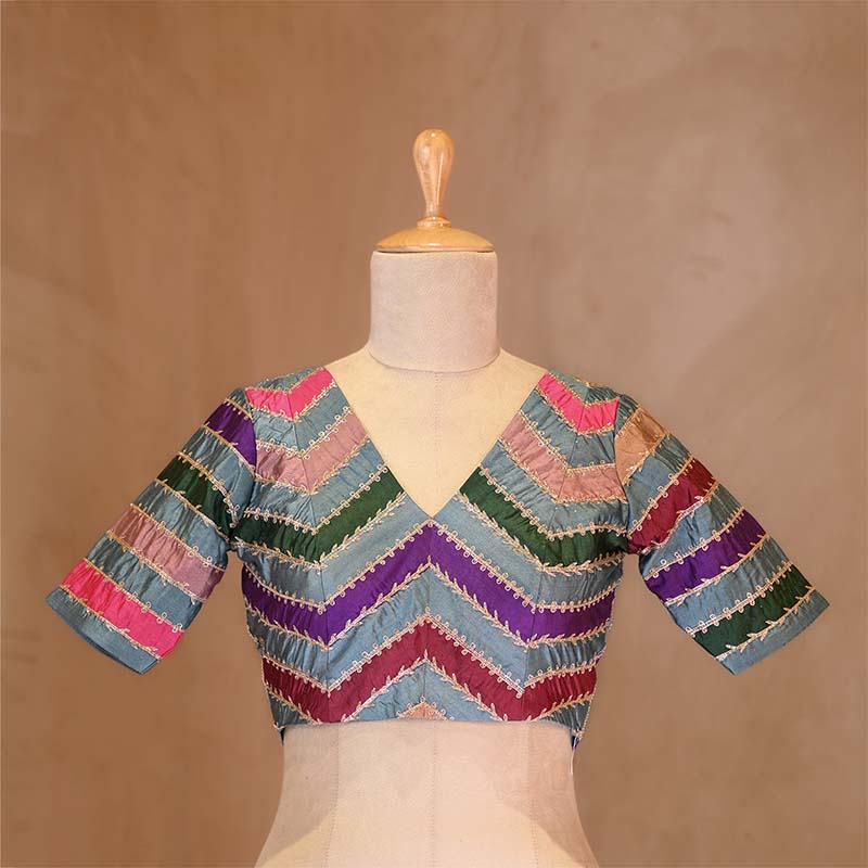This steel blue Rangkat silk blouse is adorned with detailed Gota Patti, Aari work, and Cutdana hand embellishments all over, creating a balanced and traditional look. Designed with a V-shaped neckline and half sleeves, this blouse adds a refined touch to any saree ensemble, perfect for festive or special occasions.