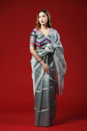 This steel blue tissue silk saree features a plain shiny base woven with silver zari stripes across the body, giving it a refined, structured appearance suitable for occasions. It is paired with a matching Banarasi silk brocade blouse fabric, intricately woven with floral silver zari and meenakari work.