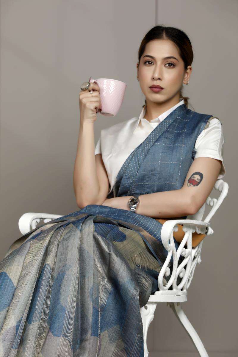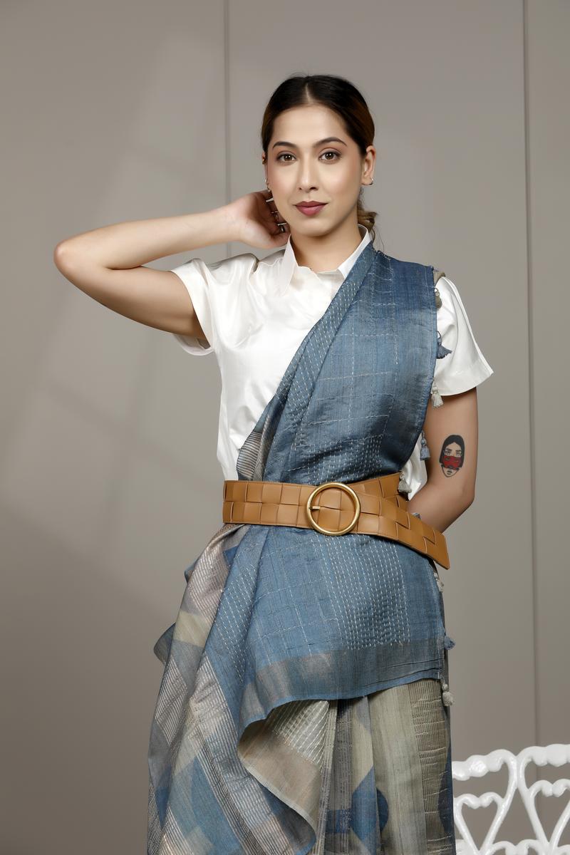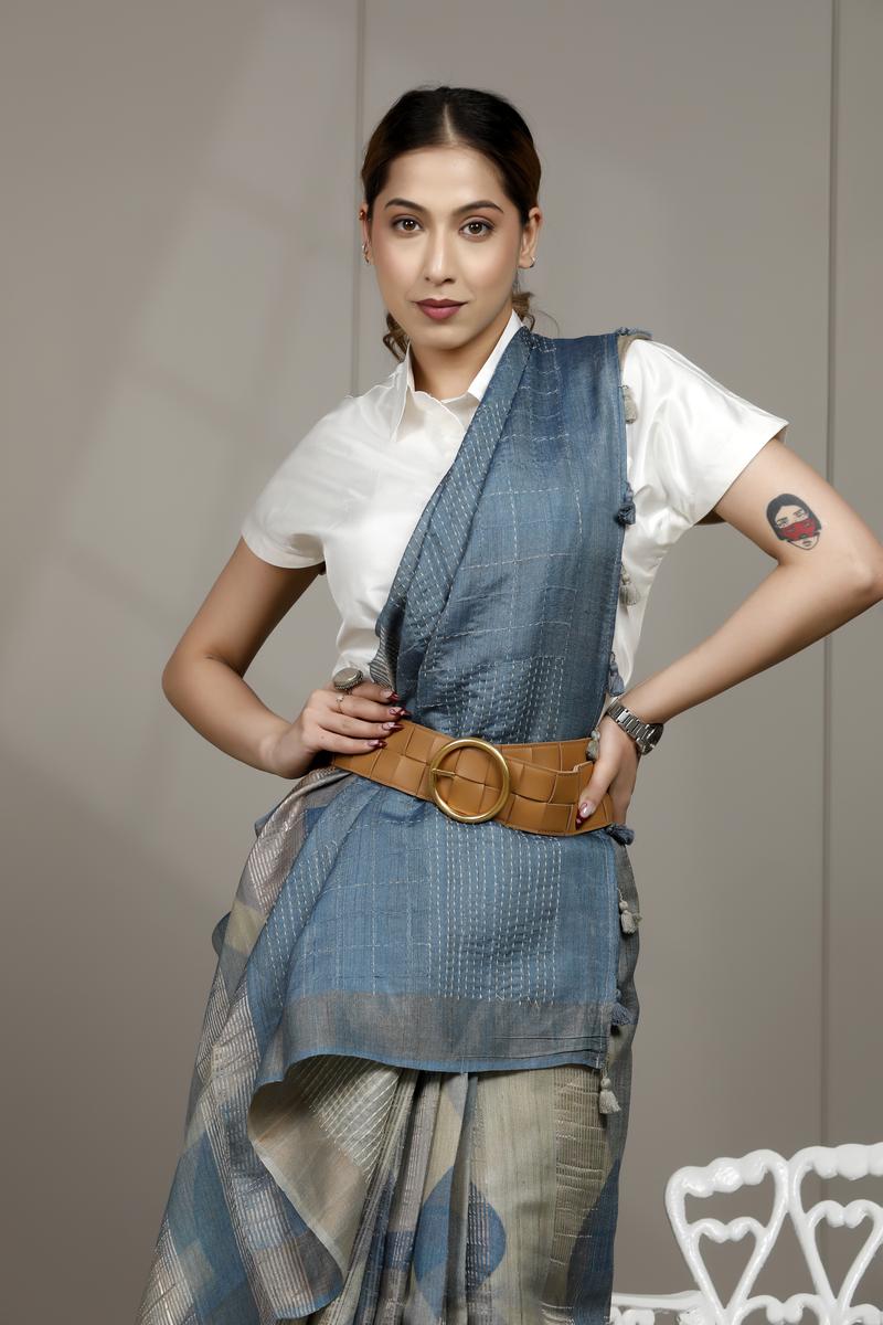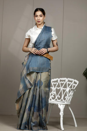 This Steel blue tussar silk saree is crafted for an office classic look. The body features an abstract print pattern combined with antique zari woven stripes. The border blends geometric structure with traditional weaving in gold zari, while the pallu is highlighted with kantha-style hand embroidery. It is paired with a floral printed tussar silk unstitched blouse piece, adding a soft contrast to the saree’s aesthetic.