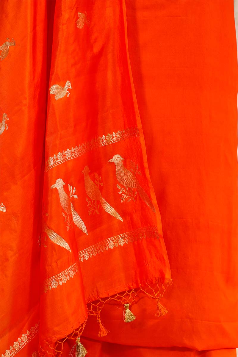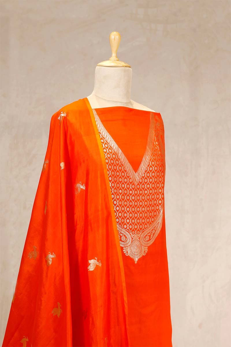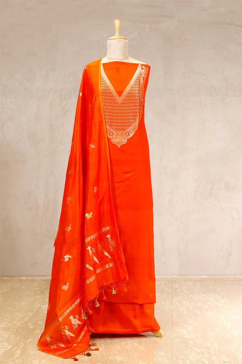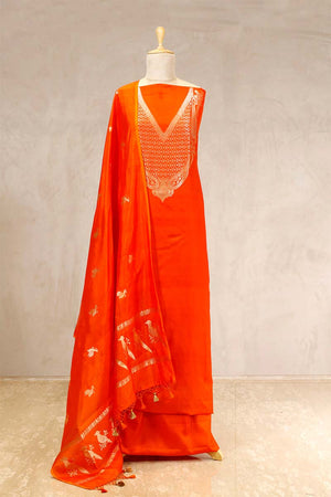 This tangerine orange Katan silk suit set is a vibrant choice for festive and cultural celebrations. The kurta features intricate gold zari weaving around the V-shaped neckline, adding a graceful touch to the ensemble. Paired with a bird motif Puna silk dupatta and a matching bottom pant, this dress material offers both style and comfort, making it perfect for special occasions.