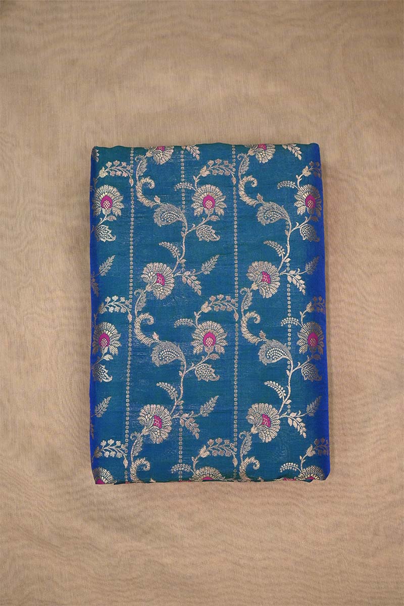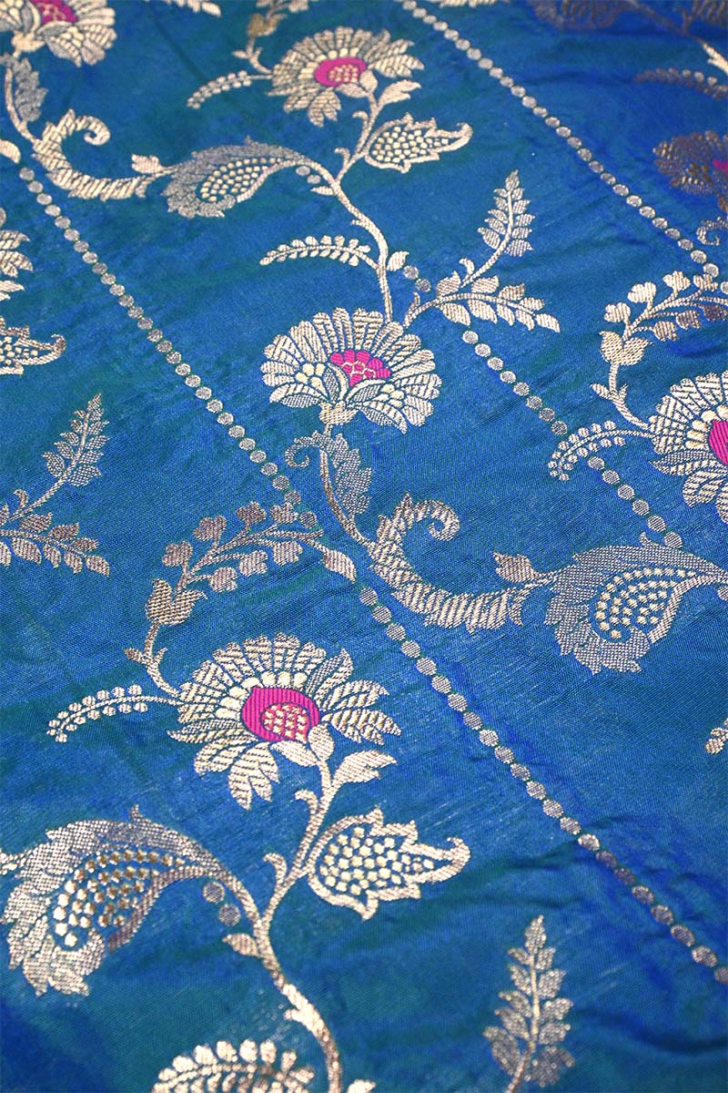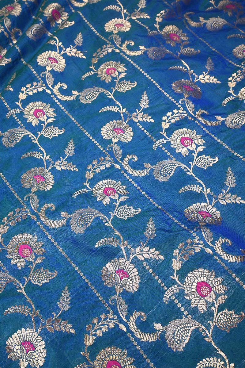 This teal blue dual-tone Banarasi silk fabric is detailed with golden zari floral motifs arranged in a vine-inspired leheriya jaal pattern. The design is further enhanced with red meenakari work, adding depth and contrast to the overall look of the fabric.