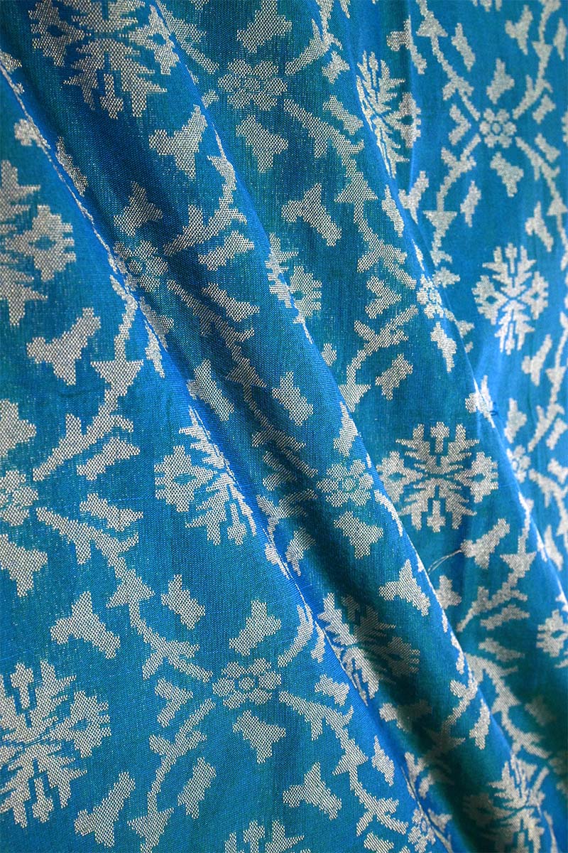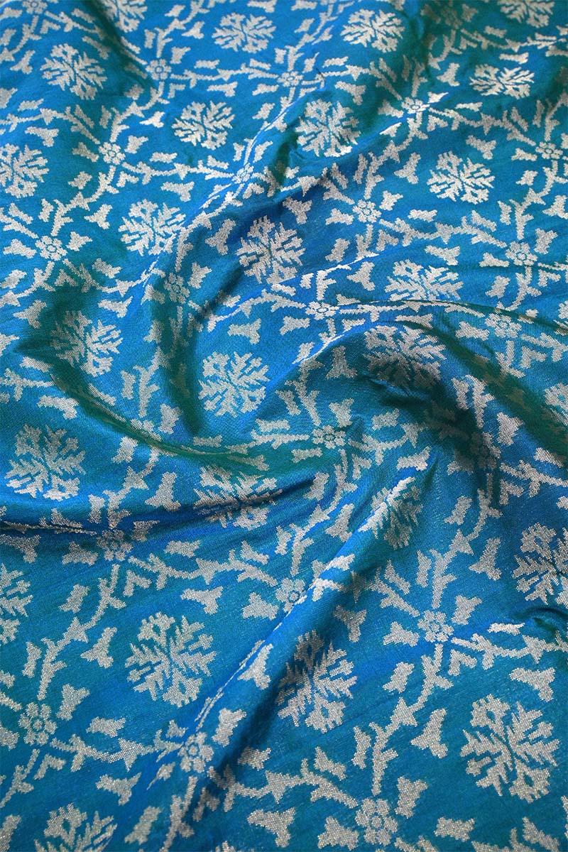 This teal blue Banarasi silk fabric features ikkat-inspired weaving patterns created with gold zari all over. The blend of traditional Banarasi style with ikkat design and dual shade of green and blue base makes it a distinctive choice for blouses or ethnic outfits.
