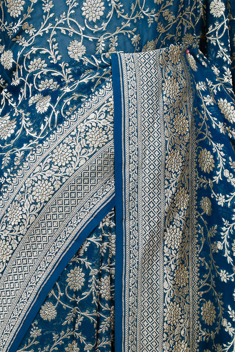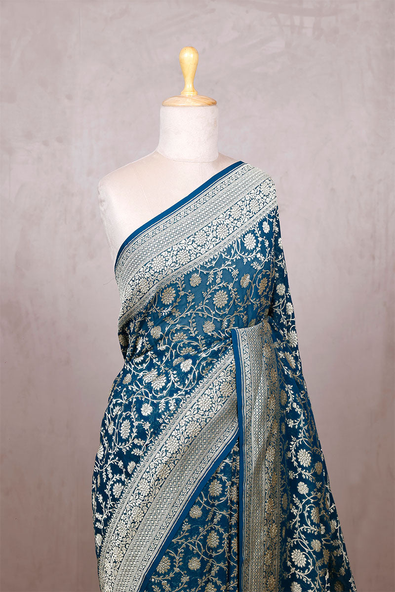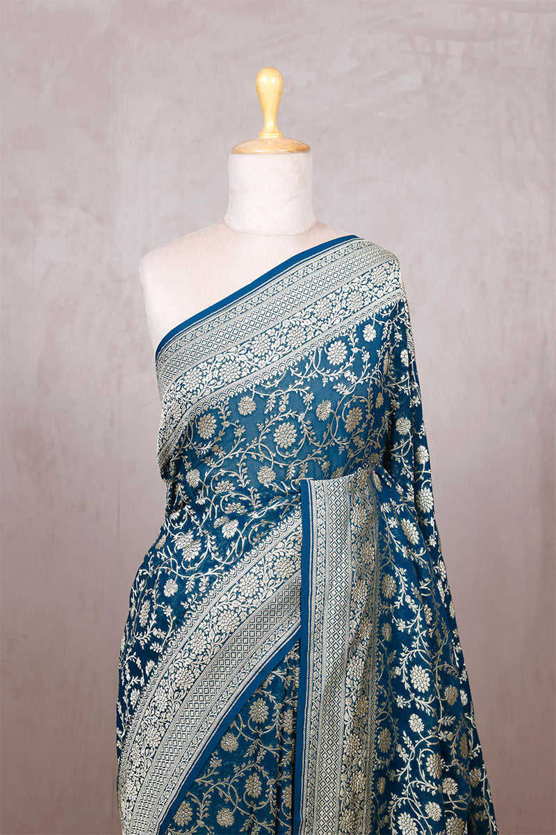 This Teal Blue Banarasi Georgette Khaddi saree is handloom woven with an intricate gold zari floral jaal in the traditional Jangla style, creating a rich and detailed jaal pattern across the body. The border and pallu feature elaborate gold zari floral work. It comes with a matching unstitched blouse piece for customized stitching.