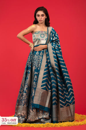 Discover the allure of our Teal Banarasi Katan Silk Lehenga. This mesmerizing piece is a canvas of ethnic gold zari woven motifs, embellished with enchanting mirror work. The matching Meenakari woven unstitched blouse piece adds an extra touch of sophistication. Completing the ensemble is a stunning teal Banarasi silk dupatta with intricate zigzag patterns and mirror work. Elevate your bridal, festive, and wedding look with this teal treasure.