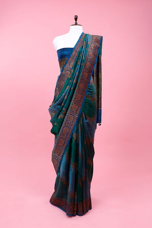 Discover timeless elegance with our Raw Silk Saree featuring antique zari woven Leheriya stripes and intricate rangkat weaving. The contrast antique zari border and pallu add a touch of opulence. This saree exudes a classic charm, ideal for formal and celebratory occasions. It comes with a matching unstitched blouse piece, allowing you to customize your perfect ensemble. Elevate your style with this exquisite piece.