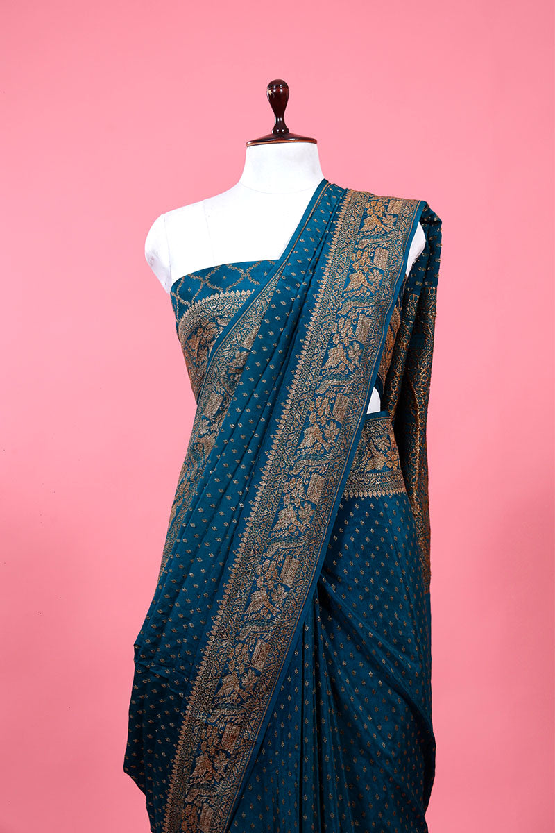 Step into elegance with our teal crepe khaddi silk saree boasting antique zari-woven circular buti throughout. The intricate antique zari ethnic woven border and pallu add a touch of timeless charm. Paired with an unstitched blouse piece, this saree exemplifies sophistication, making it an exquisite choice for those seeking traditional grace and cultural finesse in their attire.